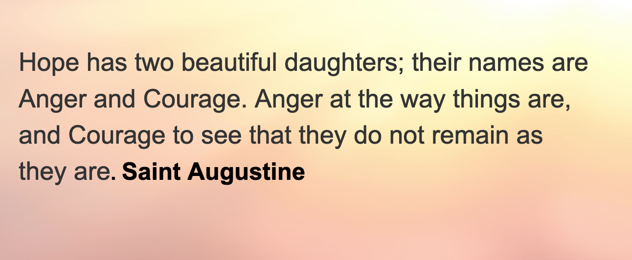 “Hope has two beautiful daughters; their names are Anger and Courage. Anger at the way things are, and Courage to see that they do not remain as they are.” Saint Augustine