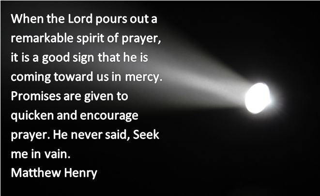 When the Lord pours out a remarkable spirit of prayer, it is a good sign that he is coming toward us in mercy. Promises are given to quicken and encourage prayer. He never said, Seek me in vain. Matthew Henry’s concise commentary