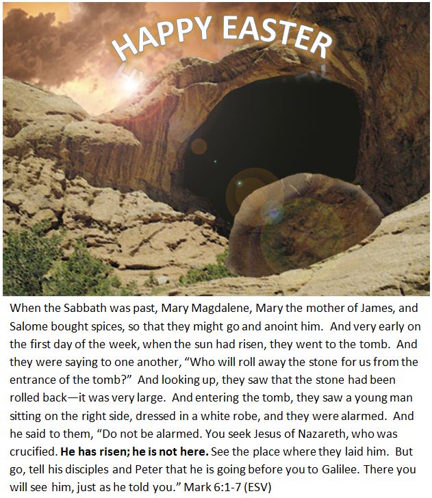 We are the same way as the disciples, we know, there is enough recorded proof, and no matter how it is explained away Jesus lived and there is proof. So every year we go through the motions, watch the Easter movies about the bunny, get a big basket full of candy, we run around and celebrate the hidden eggs. But what are we celebrating? I do not think it is bad to celebrate Easter and the opportunity to bring your family together, family is so important. Behold, children are a heritage from the Lord, the fruit of the womb a reward. Like arrows in the hand of a warrior are the children of one’s youth. Blessed is the man who fills his quiver with them! He shall not be put to shame when he speaks with his enemies in the gate. Psalm 127:3-5 ESV Is what I am trying to say is that it is awesome to get our families together when ever we can but let’s talk about what this day represents. We have so much that God has provided for us to know Him better than any other generation that has ever lived. We have access to bible study tools like e-Sword* for desktops or the Blue Letter Bible* for online and phone. We have Bibles online* that will read out load to you and tools to look up Subjects* that you want to learn more about and a cross reference tool* as well. Jesus is trying to reach out more than any other time, His word has been translated into so many different languages. He can now touch you no matter where we are in this world. He is responsible for giving people the knowledge to create these tools that we have been given to get to know Him better. He is reaching out to us: Behold, I stand at the door and knock. If anyone hears my voice and opens the door, I will come in to him and eat with him, and he with me. Revelation 3:20 ESV “When you continue to embrace all that I teach, you prove that you are my true followers. For if you embrace the truth, it will release more freedom into your lives.” John 8:31-32 TPT